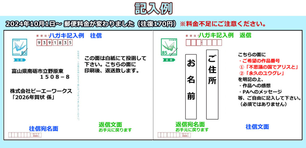 ※2024年10月1日より郵便料金が変わりました。料金不足にご注意ください。(往復ハガキ170円)